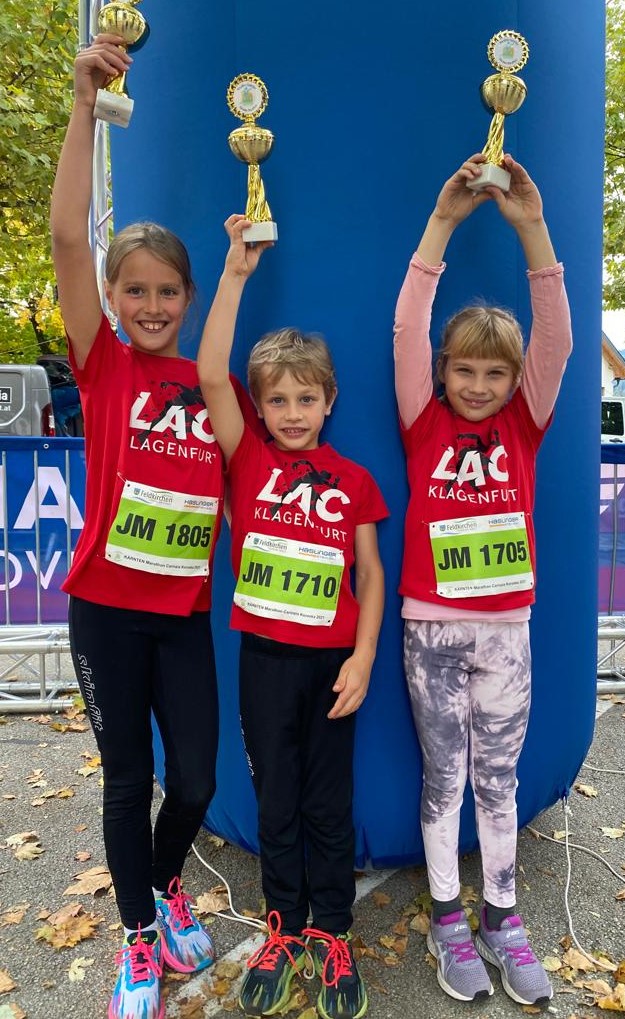 Die Erfolgsserie unserer Nachwuchsläufer reißt nicht ab. Beim 5. Kärnten Marathon holten die LACler bei den Kinderläufen gleich drei Stockerlplätze! Leo Kury siegte in der Klasse U8, Maya Repitsch holte sich den ersten Platz der Klasse U10 und Romina Kury erkämpfte sich den zweiten Rang der Klasse U12! BRAVO GUT GEMACHT!! Foto/zVg: von links Romina, Leo, Maya