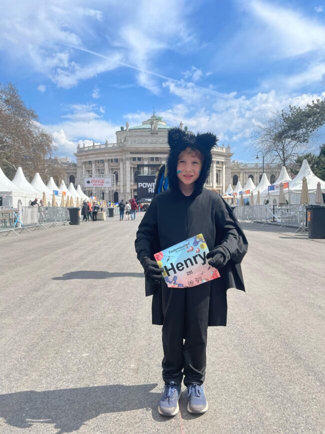 Im Rahmen des Vienna City Marathons konnten die Jüngsten der Lauffamilie einen Laufbewerb ohne Zeitnahme bestreiten (200m für Kinder von 3 – 6 Jahren, mit Verkleidung). Die LAC-Fahne hielt dabei Henry Turek (Foto zVg) von unserer Kindergartengruppe hoch! BRAVO
