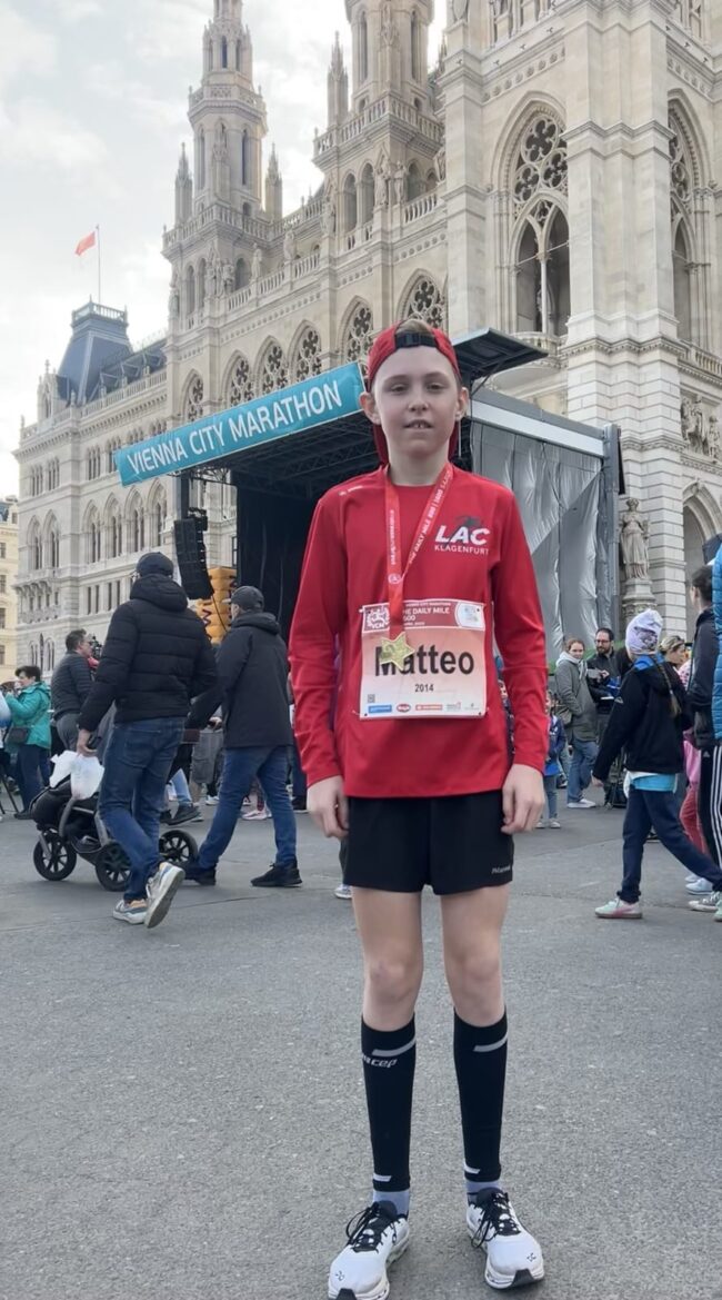Starker Auftritt von Matteo Cuoni (Foto Cuoni) bei der „The Daily Mile 1600“ im Rahmen des Vienna City Marathons. Der Schützling von unserem Lauftrainer Stefan Genser lief 4:37 Minuten über die 1,6 Kilometer, ließ mehr als 750 Starter (von der Klasse U7 – U16) hinter sich und holte sich den Sieg der Klasse U14!