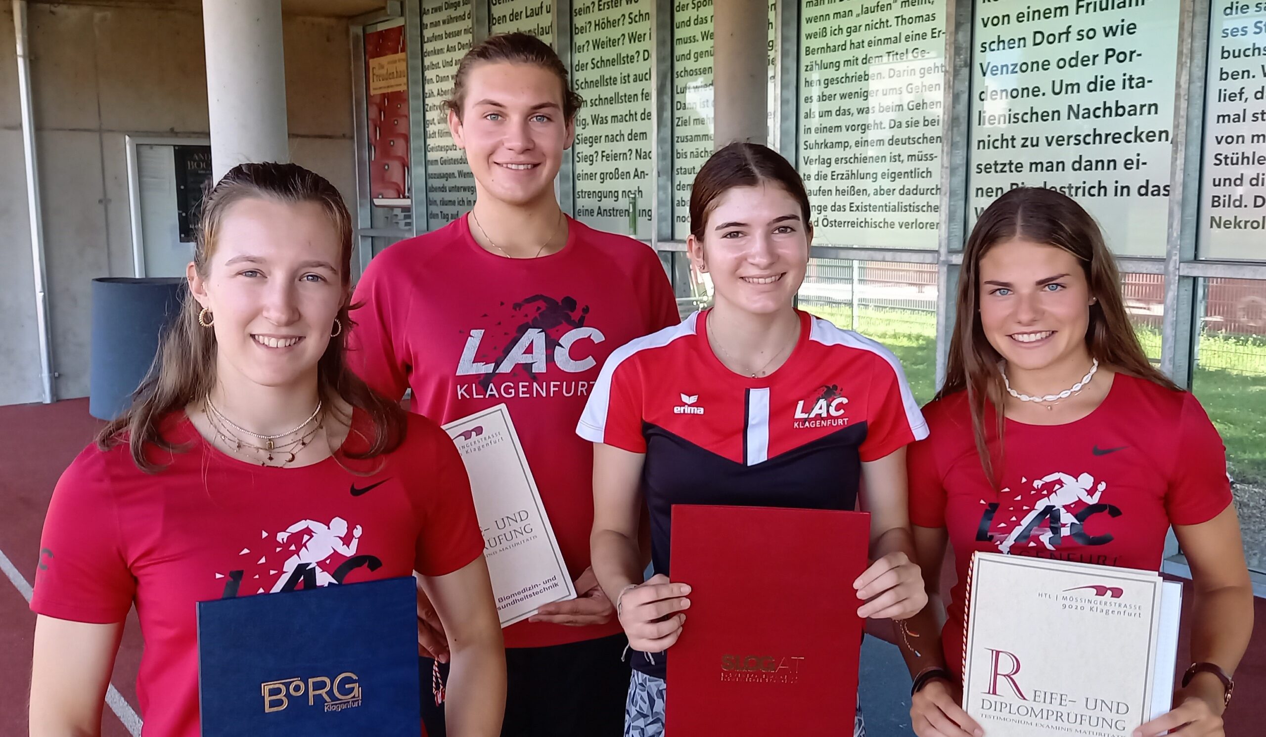 Bestes Beispiel für das perfekte miteinander von Sport und Schule sind die heurigen LAC-Maturanten (Foto von links): Lorena Miklau (Sportborg mit Auszeichnung), Lukas Gasper (HTL-Mössingerstraße mit Auszeichnung), Elisabeth Bluch (slowenisches Gymnasium mit Auszeichnung), Leonie Elbischger (HTL-Mössingerstraße). Unsere Maturanten bestätigen mit ihren sportlichen und schulischen Höchstleistungen das Zitat des berühmten römischen Dichter Juvenal – „Mens sana in corpore sano“ („ein gesunder Geist in einem gesunden Körper“).