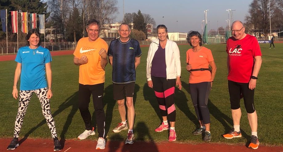 Unsere ÖSTA-Athleten vom ersten Freilufttraining – von links: Ingrid Bluch, Manfred Widmer, Fritz Sporis, Karin Prenner, Sigrid Preis und Trainer Gunther Spath