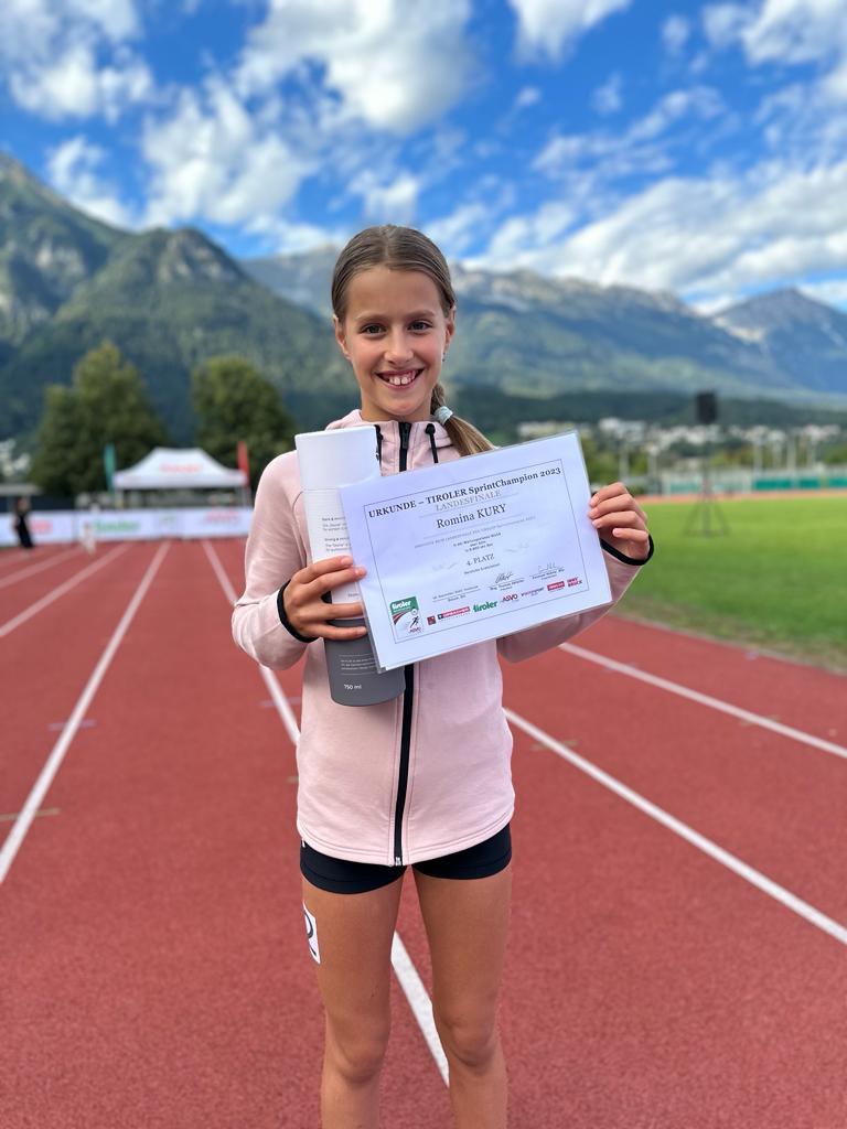 Höchst erfolgreicher Auftritt von Romina Kury beim „Tiroler SprintChampion 2023“ (als gebürtige Tirolerin ist sie startberechtigt). Nach dem Vorkampf in Reutte mit 40 Starterinnen (Rang 2) erkämpfte sie sich heute in Innsbruck beim Landesfinale den vierten Platz mit persönlicher Bestleistung von 8,885s über die 60 Meter und qualifizierte sich damit fürs Euregio-Finale (Tirol/Südtirol/Trentino) am 7. Oktober in Innsbruck!
